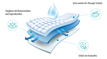Wysokiej jakości celuloza w połączeniu z superchłonnym materiałem zapobiega przeciekaniu. Wytłaczane rowki w kształcie rombów umożliwiają równomierne rozprowadzanie wszelkich płynów.